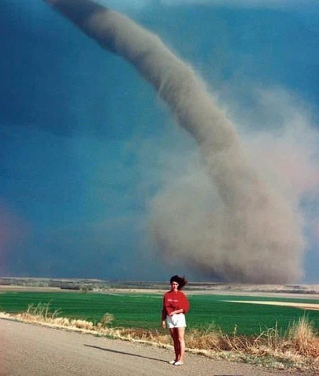 Девушка из Небраски — Одра Томас, фотографируется на фоне торнадо, Лето 1989 г.