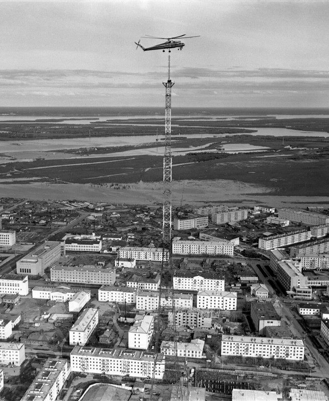 Монтаж телевизионной башни при помощи вертолета Ми-10К, июль 1982 года, Якутск.