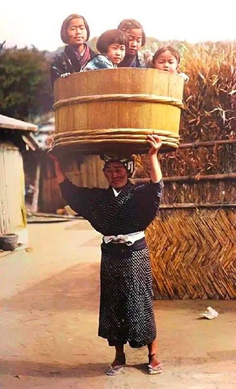 Японка, несущая своих детей в кадушке на голове, Япония, 1900-е.