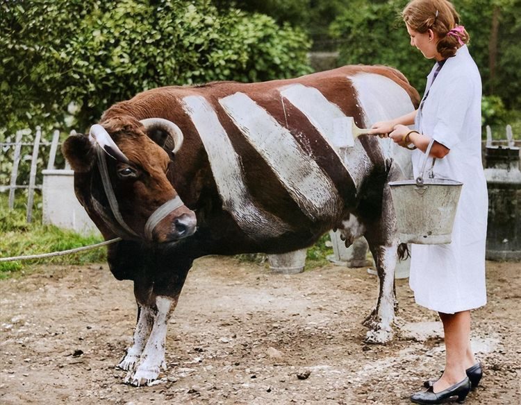 Британская фермерша рисует на своей корове полосы, чтобы повысить ее видимость в ночное время и предотвратить ДТП, если она выйдет на дорогу во время отключения света, вызванного интенсивными бомбардировками во время Второй мировой войны, 1939 год