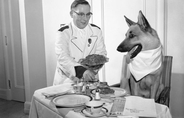 Голливудская звезда овчарка Рин Тин Тин обедает в своем номере отеля «Sheraton». Чикаго, 1956 год.