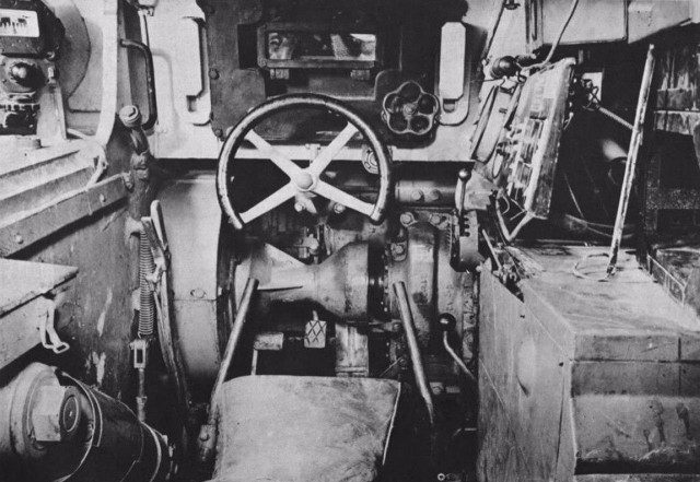 Интерьер немецкого танка Тигр (Panzerkampfwagen VI Tiger) изнутри, место водителя. 1943 год. Вентиль рядом с прибором наблюдения предназначен для подъёма и опускания броневой заслонки.