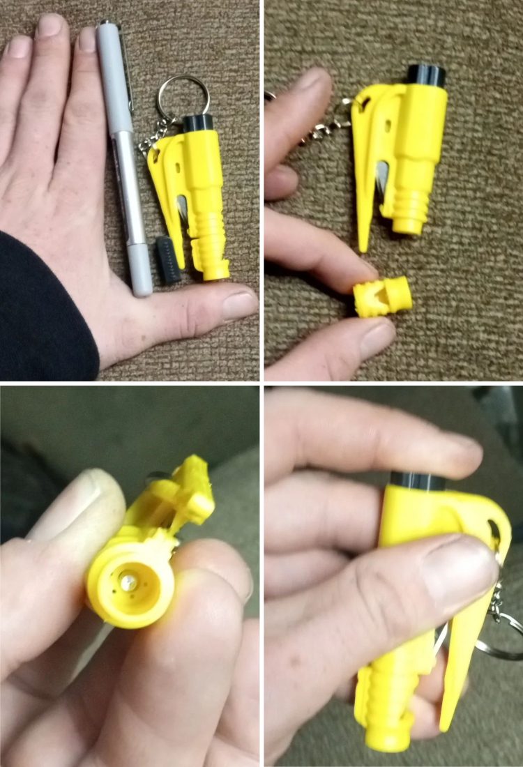 Вопрос: «Что это за предмет размером с брелок? В нём есть лезвие, похожее на нож для открывания писем, съемный пластиковым колпачок с отверстием, похожий на свисток, и кнопка, при нажатии на которую с другой стороны слегка вылезает металлическую стержень»