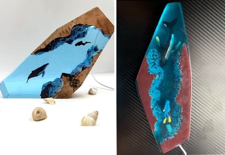 «Лампа из дерева и эпоксидной смолы за 40 долларов под названием «Кит и дайвер» »
