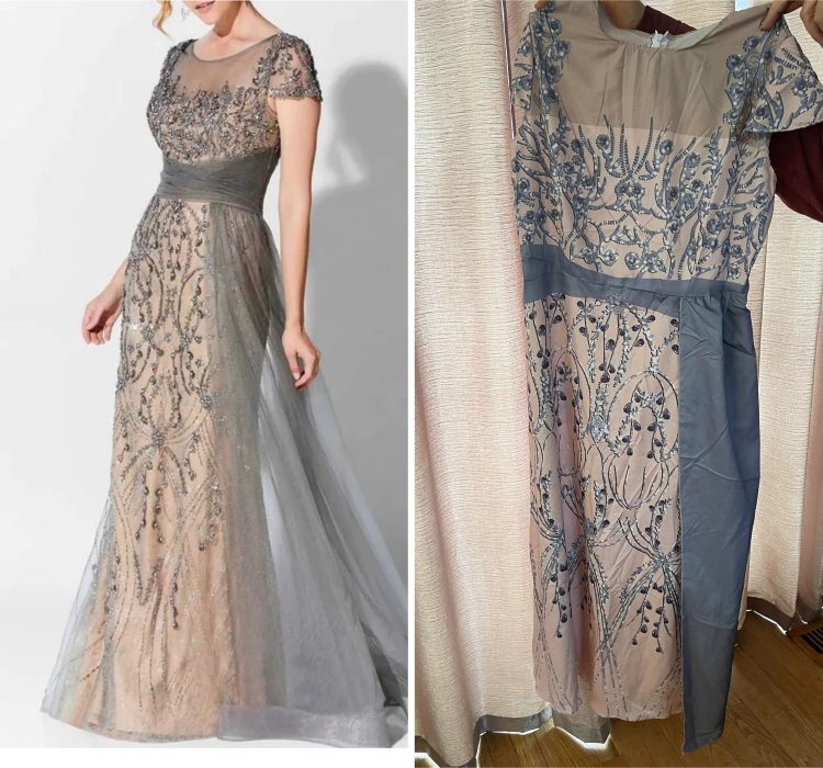 Весь шифон, бисер и стразы на фото слева были просто распечатаны на платье, которое было доставлено. Это обычный принт, Карл!