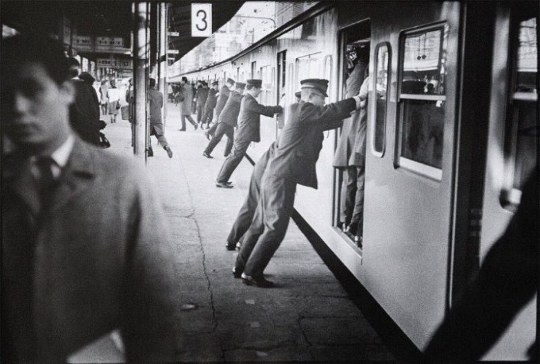 Трамбовщики пассажиров в японском метро, 1966 год.
