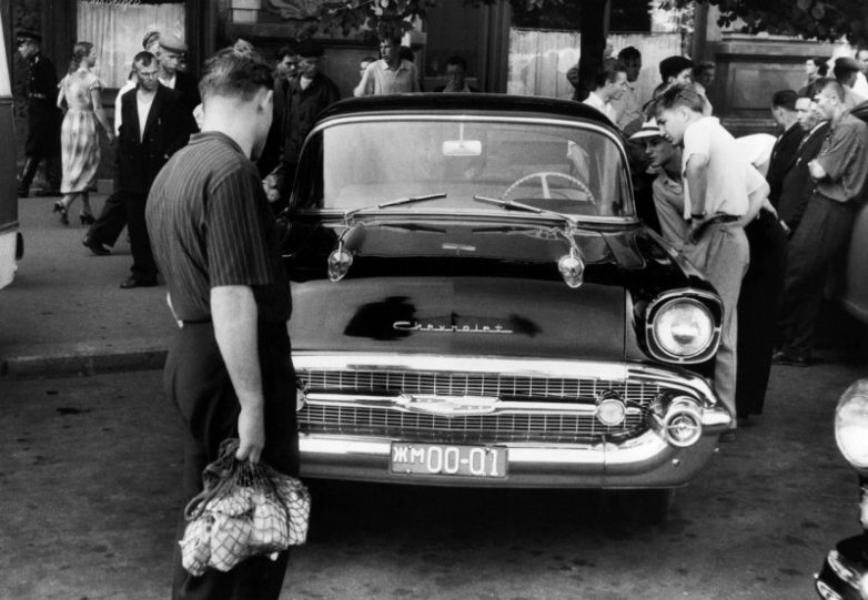 Прохожие рассматривают автомобиль Chevrolet Bel Air у гостиницы «Националь», Москва, 1957 год