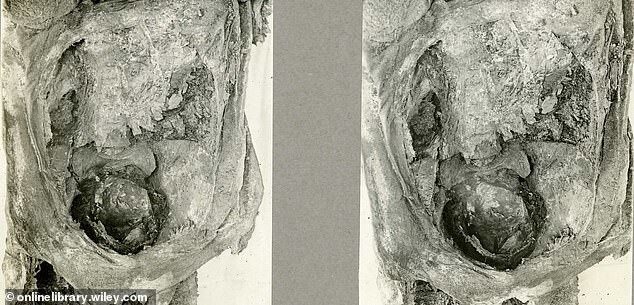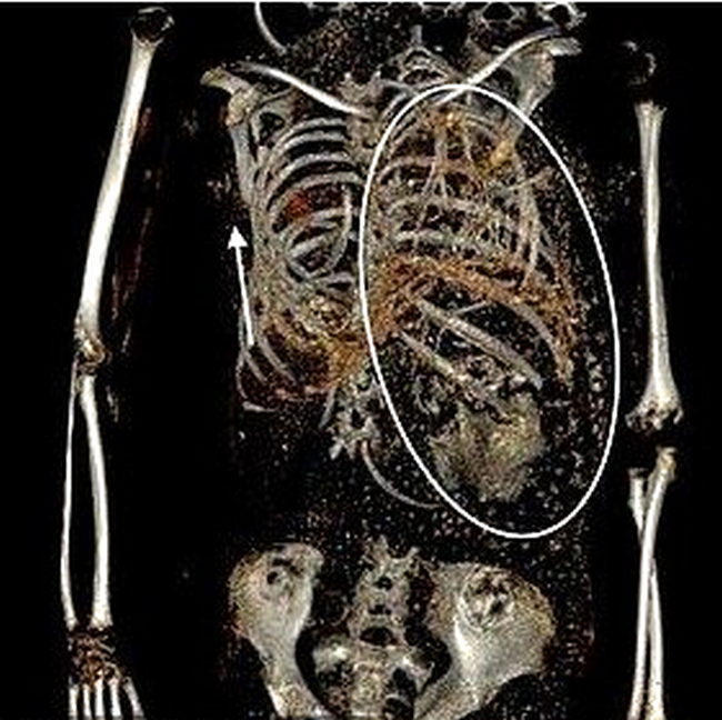 Исследователи из Университета Джорджа Вашингтона провели компьютерную томографию тела, обнаружив голову ребенка, застрявшую в родовом канале, и еще один плод, каким-то образом переместившийся в грудную полость.