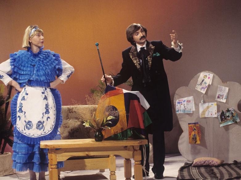 Михаил Задорнов и ведущая телепрограммы «Аншлаг» Регина Дубовицкая во время представления «Аншлаг кайфует», 1997 год