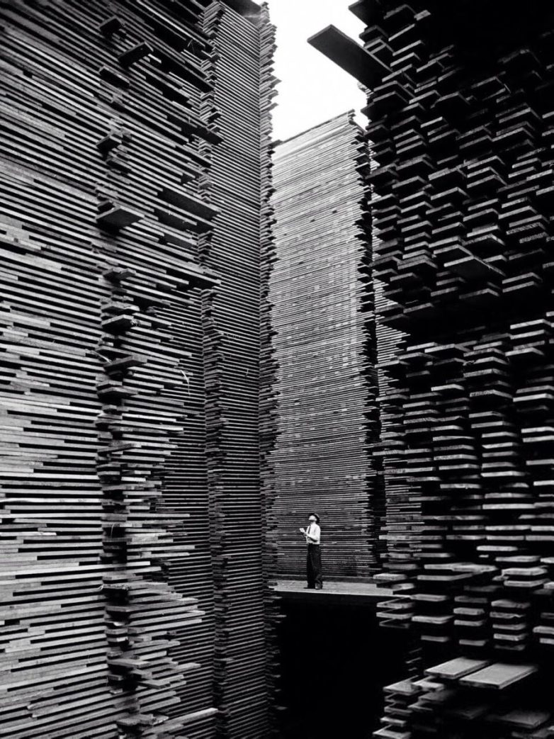 Мужчина стоит на складе пиломатериалов компании Seattle Cedar Lumber Manufacturing, 1939 год