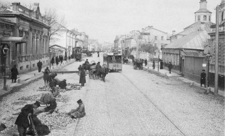 Рабочие прокладывают мостовую из камня на Арбате, Москва, 1890-1900