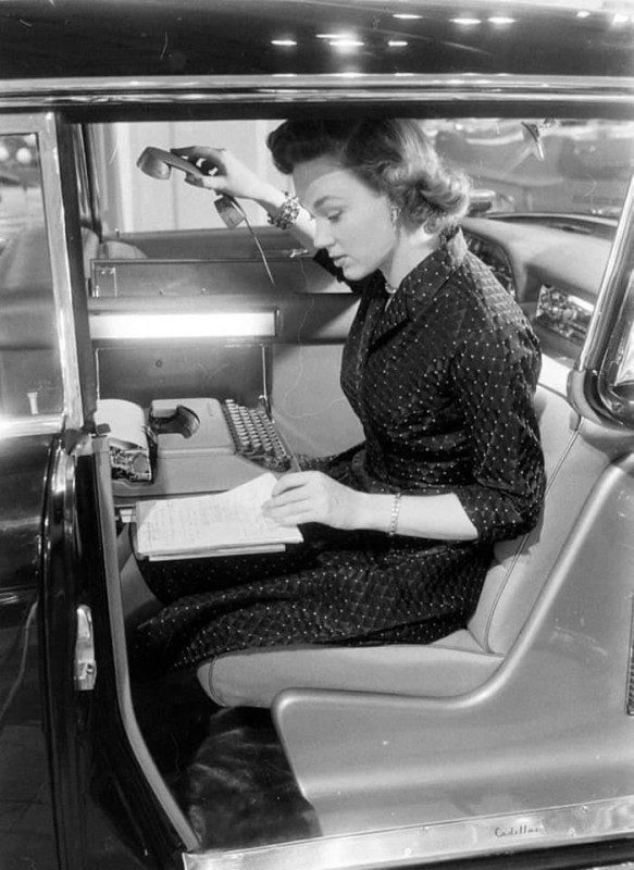 Мобильный секретарь в «Кадиллаке» с письменным столом, пишущей машинкой и телефоном. 1950-е