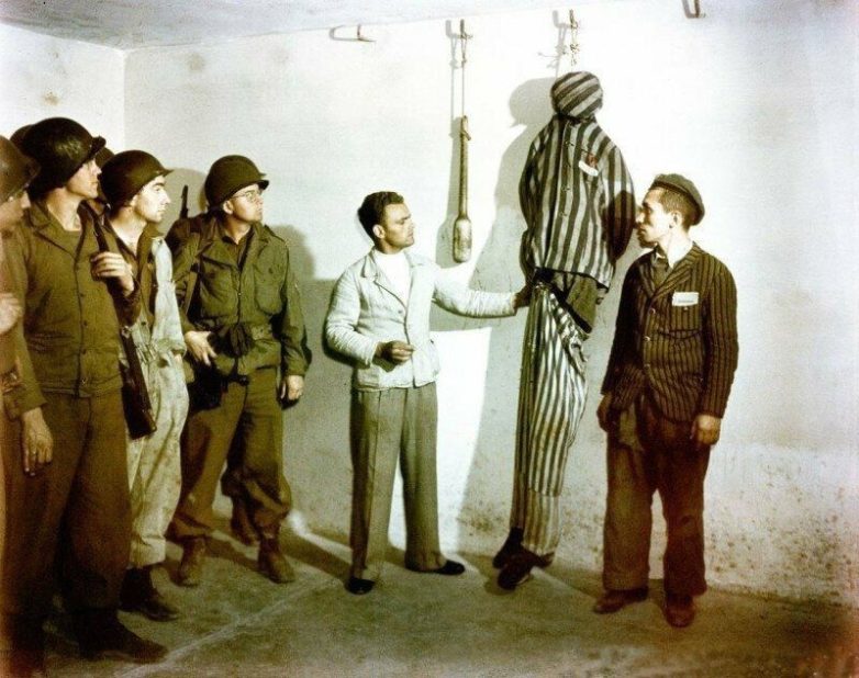 Американским солдатам показывают один из способов казни, который применялся в концлагере Бухенвальд, 18 апреля 1945 года.