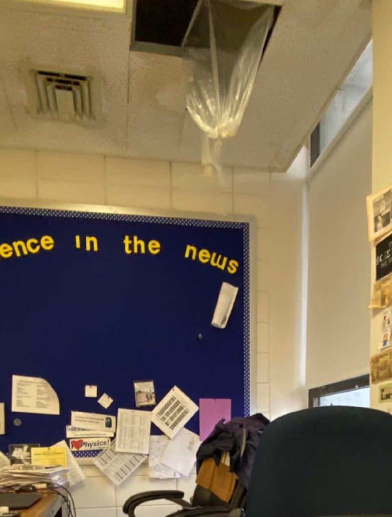 13. «Школе требуется ремонт. Учительница боится, что пакет однажды прорвётся»