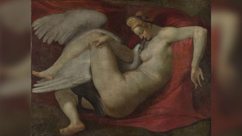На картине Микеланджело «Леда и лебедь» изображена сцена из античной мифологии, в которой бог Юпитер, приняв облик лебедя, соблазняет Леду, царицу Спарты. Согласно мифу, Елена Троянская была одним из их отпрысков. Оригинал картины Микеланджело утрачен, сохранилось лишь небольшое количество копий, сделанных другими людьми.