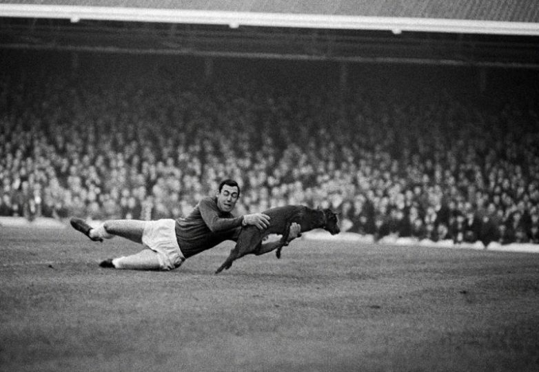 Голкипер «Лестер Сити» Гордон Бэнкс ловит выбежавшую на поле собаку во время матча английской премьер-лиги с «Манчестер Юнайтед», Англия, 1965 год.