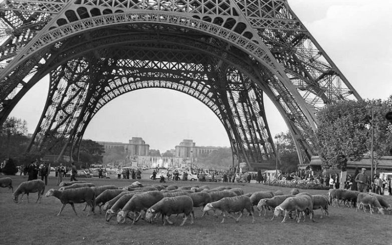 Французские фермеры и их овцы протестуют у Эйфелевой башни против строительства военной базы на своих землях, 1972 год.