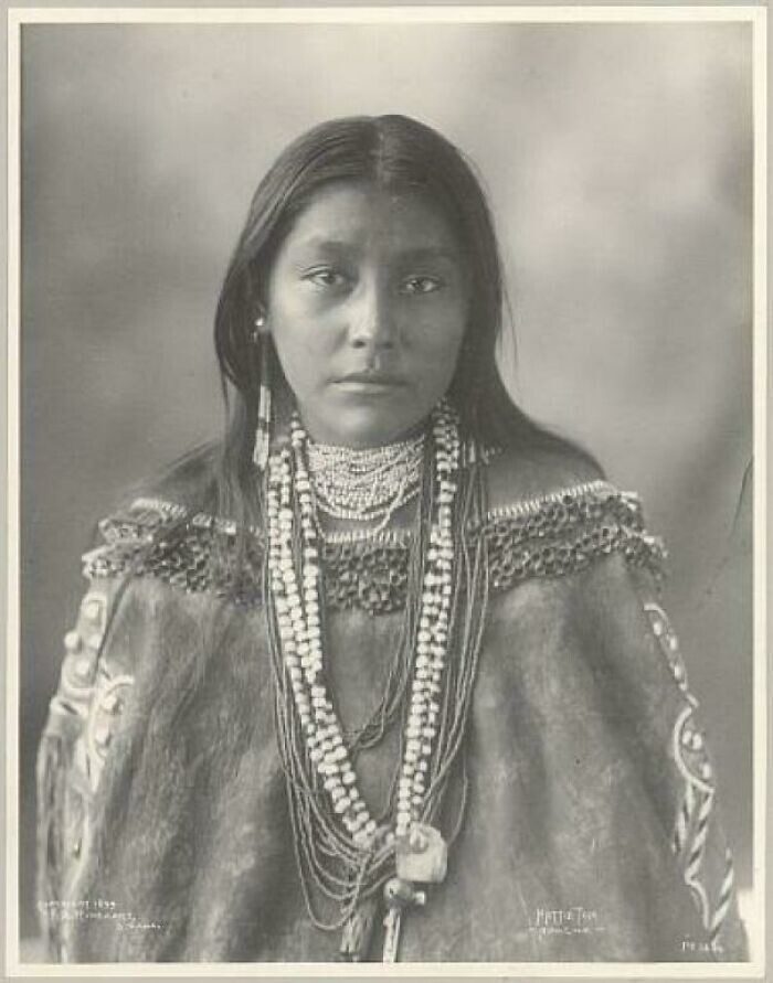 Студийный портрет Хэтти Том, молодой женщины из племени чирикауа-апачей, сделанный на съезде индейцев США в рамках Транс-Миссисипской и Международной выставки в Омахе, 1898 г.