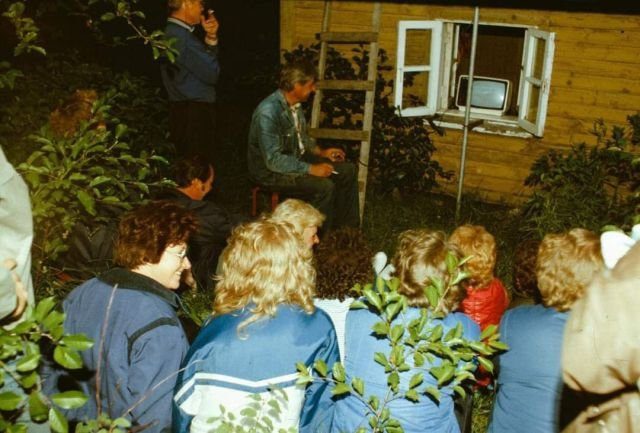 Люди ездили из Южной Эстонии в Таллинн и Северную Эстонию, чтобы посмотреть фильм. На снимке люди собрались посмотреть фильм в одном доме отдыха, серая трубка — это антена, используемая для просмотра финского телевидения