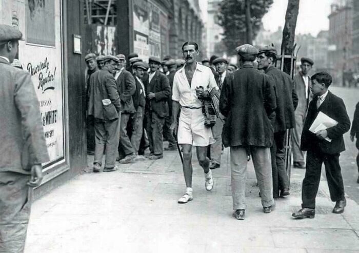 Сторонник реформы мужской одежды идет по улице Стрэнд в Лондоне. Партия реформы мужской одежды была сформирована в межвоенные годы в Великобритании, 1930 г.