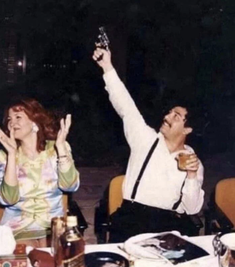 Кусей Хусейн, младший сын Саддама Хусейна, стреляет из револьвера в воздух во время светского мероприятия, 1980-е