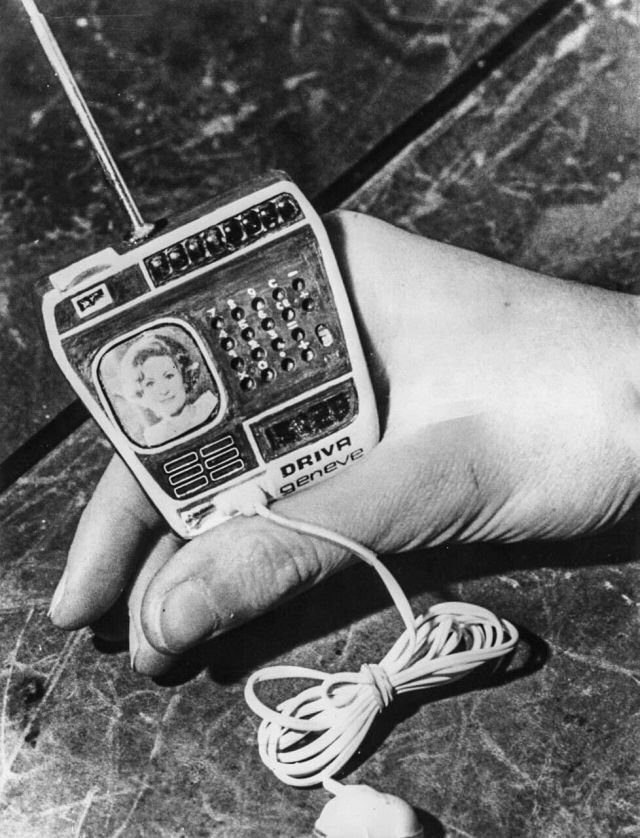Часы компании Driva Geneve из Швейцарии, с телевизором, радио и калькулятором, 1976 год. Аккумулятор приходилось носить в кармане.