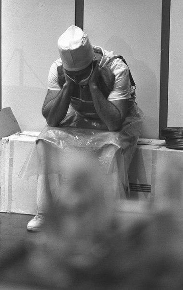 Хиpyрг киевской больницы сидит после опеpации на сердце, которую сделал ликвидатору аваpии на Чернобыльской АЭС, 1990.