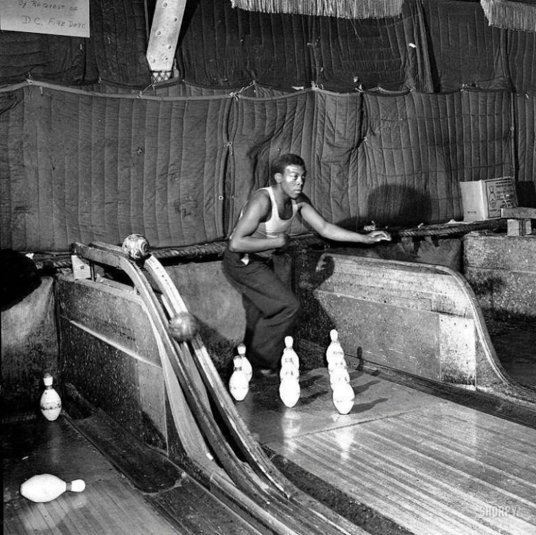Человек для расстановки кеглей в боулинге, США, 1935 год.