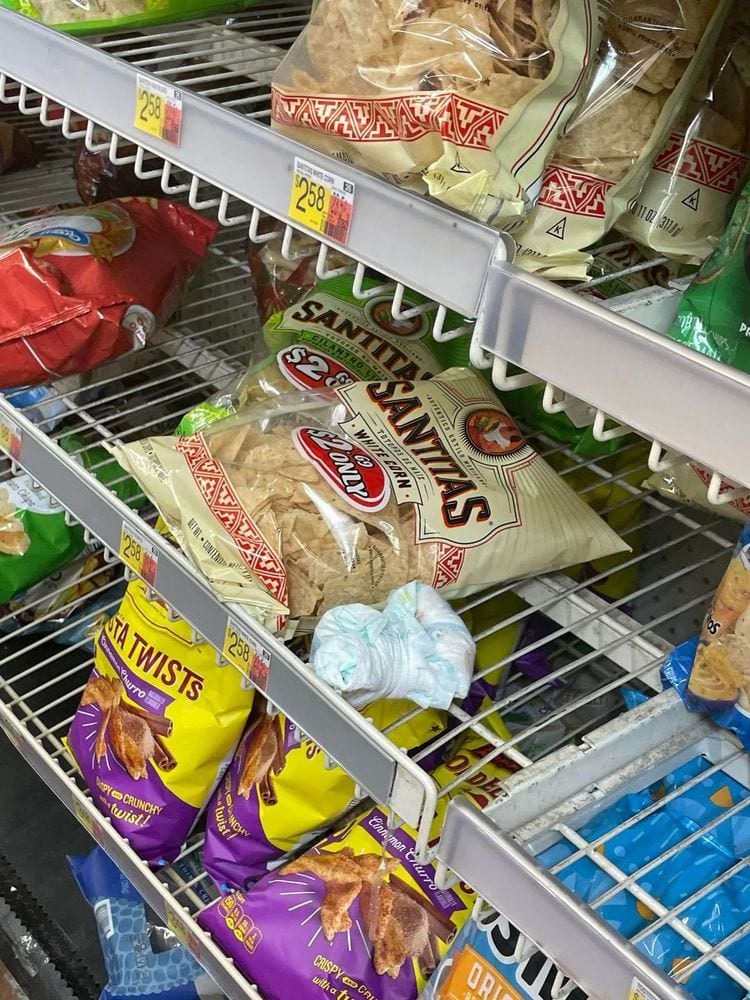 Грязный подгузник в отделе для чипсов