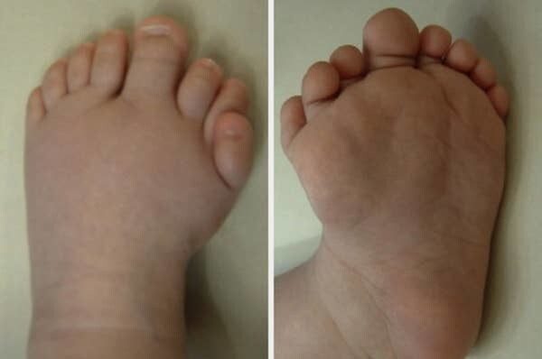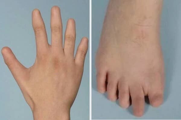 5. Синдром трехфалангового большого пальца, при котором большие пальцы имеют по три фаланги и выглядят примерно так же, как остальные пальцы