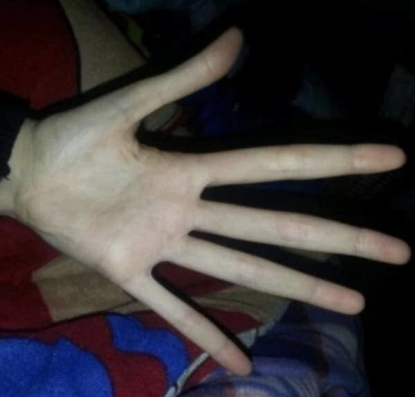 2. Рука человека с синдромом Марфана (заболевание, связанное с соединительной тканью). У людей с этим синдромом, как правило, очень длинные пальцы и конечности