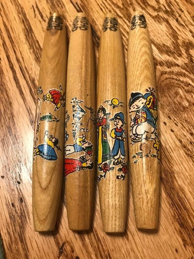 Текст вверху гласит: «Совместное счастье в браке». Сверху и снизу просверлены неглубокие отверстия, которые не соединяются по центру. Нижняя сторона объекта плоская. Это «Ют-палочки» корейская настольная игра.