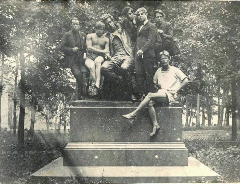 Поэт Сергей Есенин (третий справа) в компании студентов на памятнике А.С. Пушкину, Царское Село, СССР, 1924