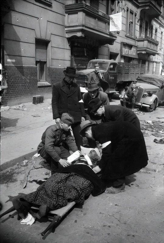 Гвардии сержант Кузьмин И.А. оказывает помощь раненому немцу, Берлин, 1945 год. Фото Гребнева.