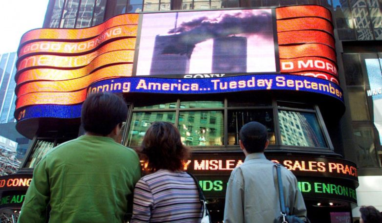 Люди на Таймс-сквер наблюдают за терактом на рекламном экране. 11 сентября 2001 г.