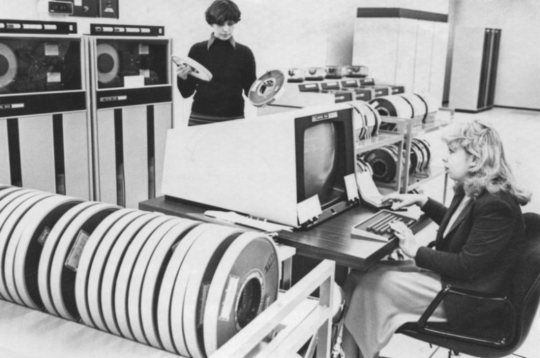 Инженер-программист и оператор обрабатывают информацию, поступающую в главный вычислительный центр Гидрометцентра СССР, 1982