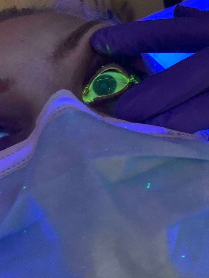 На глаз наносят специальную желтую краску, чтобы лучше увидеть порез бумагой