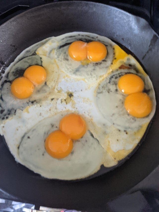 12. Четыре яйца подряд с двумя желтками в каждом
