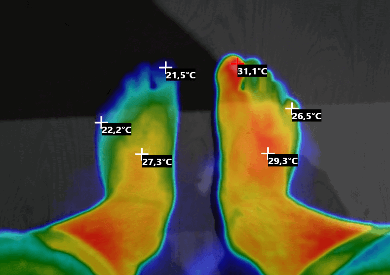 Тепловизор показывает разницу температур между нормальной стопой и стопой с вросшим ногтем