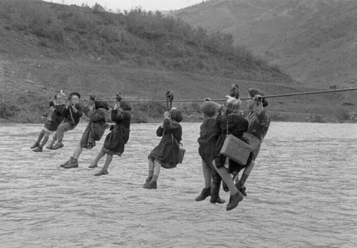 Дети добираются в школу через реку в окрестностях Модены, Италия, 1959 год
