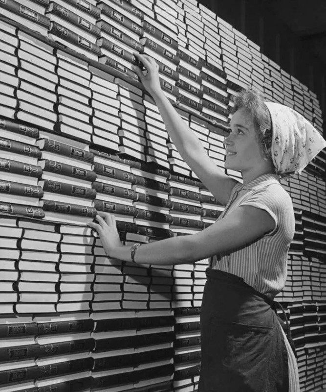 Работница Первой образцовой типографии имени Жданова возле штабелей книг, готовых к отправке в магазин, 1960