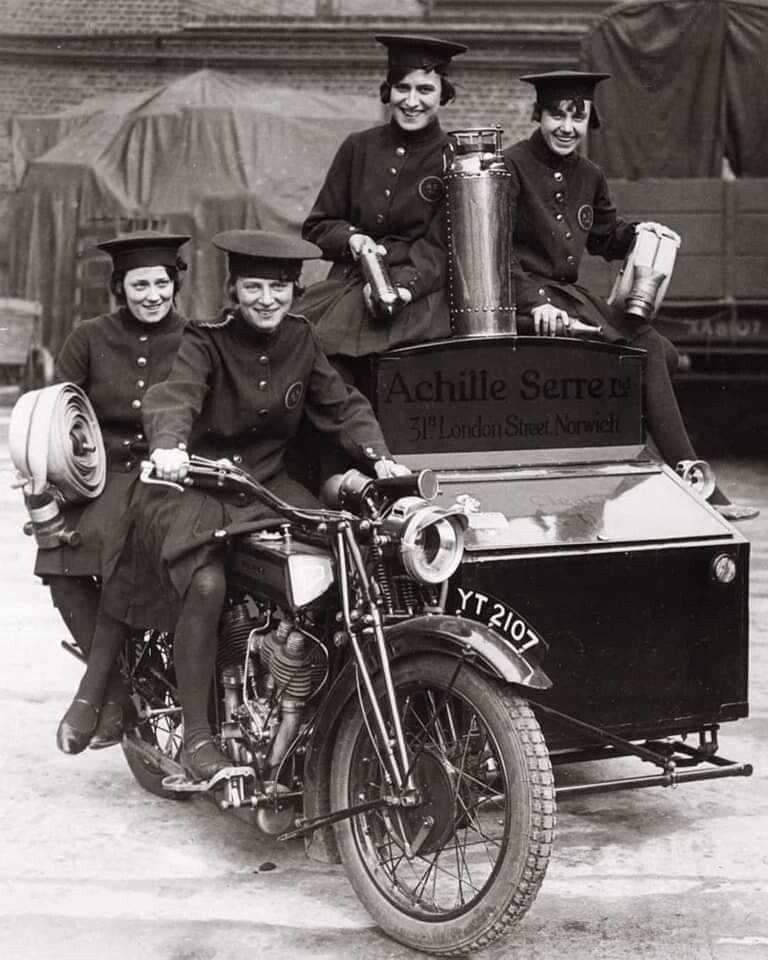 Женщины-пожарные на переоборудованном мотоцикле, Лондон, 1932 год