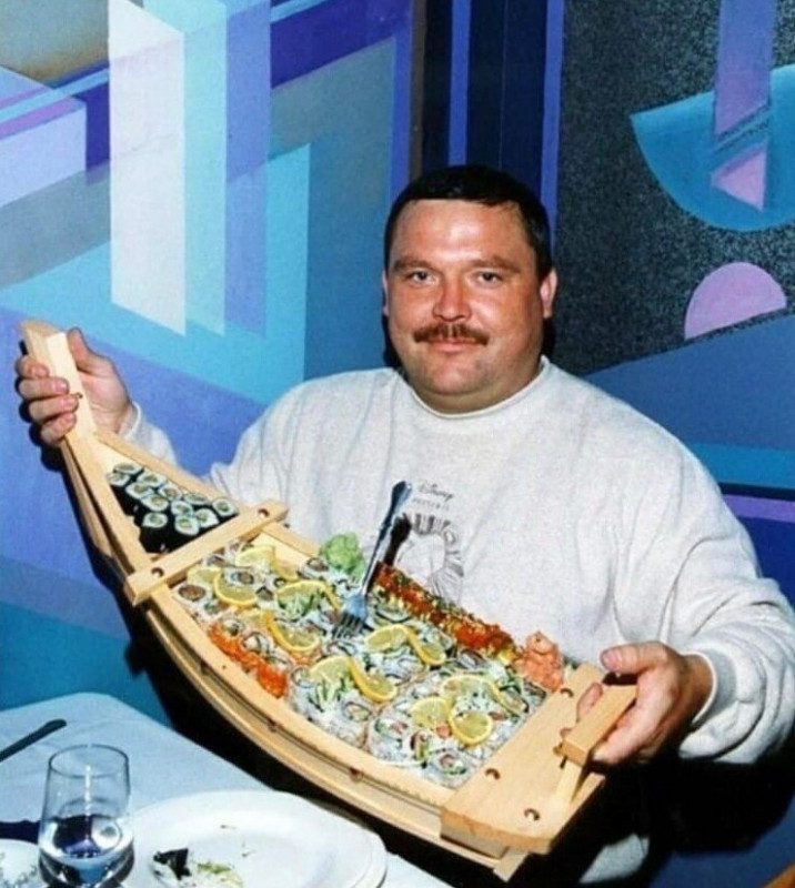 Звезда шансона Михаил Круг с диковинными суши и роллами. 90-е