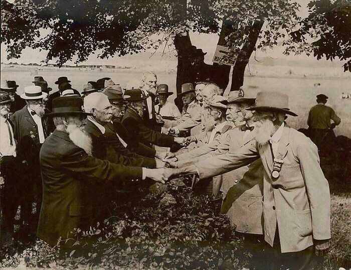 Ветераны Союза (слева) и Конфедерации (справа) встречаются в честь 50-й годовщины битвы при Геттисберге в 1913 году