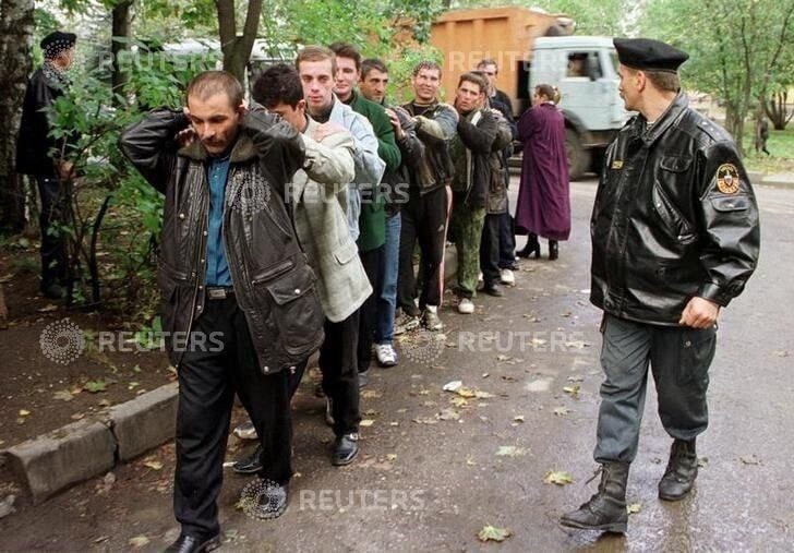 Сотрудники московского ОМОНа конвоирует группу задержанных во время рейда на одном из столичных рынков. 1999 год.