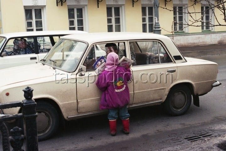 Девочка предлагает купить журналы проезжающим автомобилистам. Москва, 1995 год.