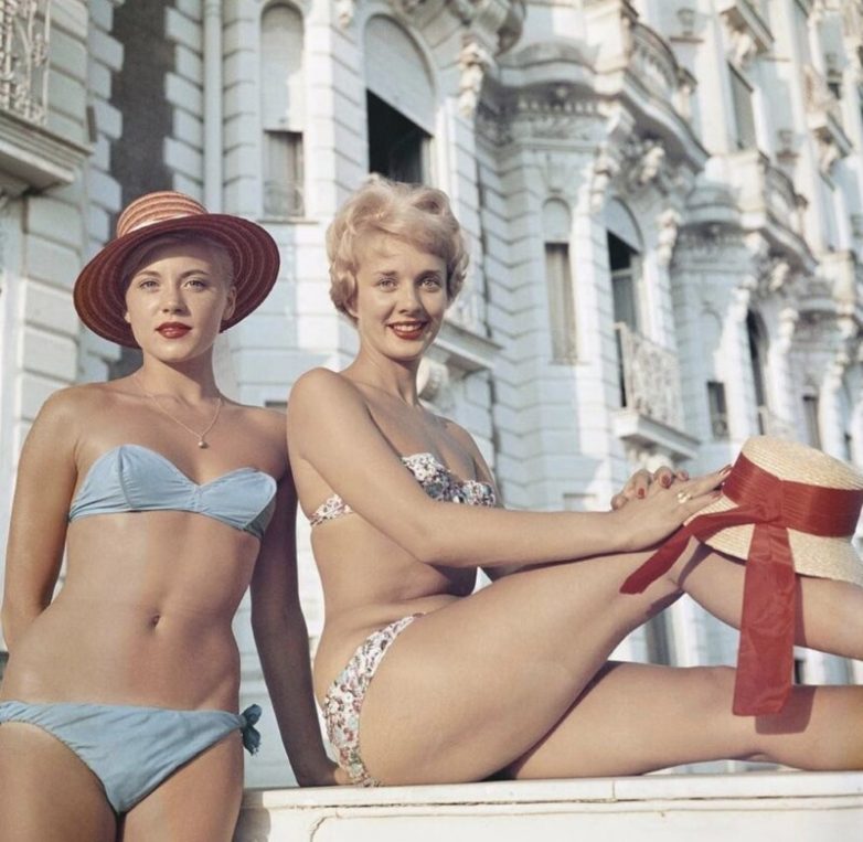3. Девушки в бикини позируют у отеля Carlton в Каннах, Франция, 1958 год