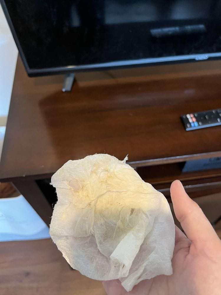 «Радуйтесь, что вы не можете почувствовать запах через экран. Процесс покупки был беспокойным, поэтому я не думал нюхать подставку, пока не принес её домой и не задался вопросом, чем, черт возьми, воняет… На фото салфетка после 2 часов протирания подставки уксусом :(», — написал автор фото
