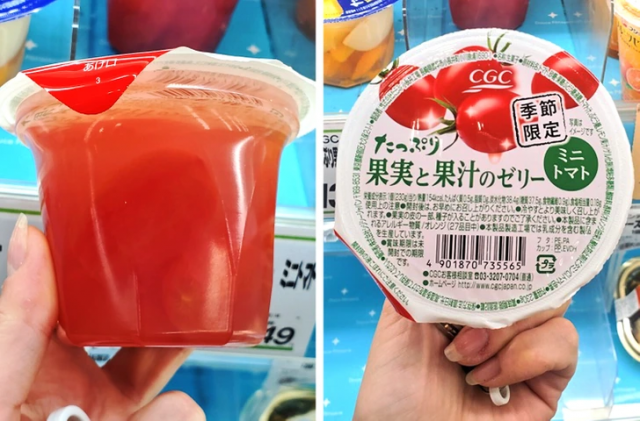 «Увидела в супермаркете в Токио вот такую дичь. Никогда не рискнула бы это попробовать. Такое желе съест только смельчак. А вы бы рискнули? Кто хочет желешки с помидорками?»
