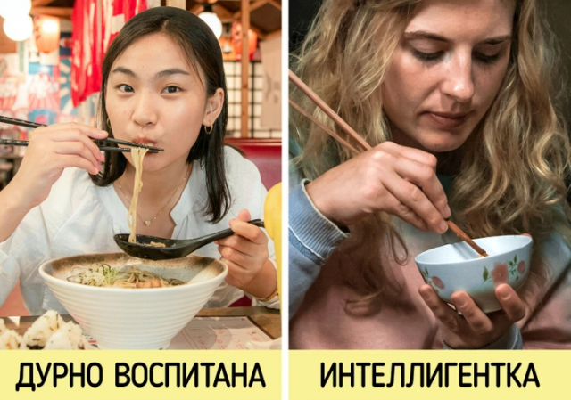 Неприлично есть, склонившись над столом. Японцы держат посуду в руке и едят палочками, сидя с прямой спиной